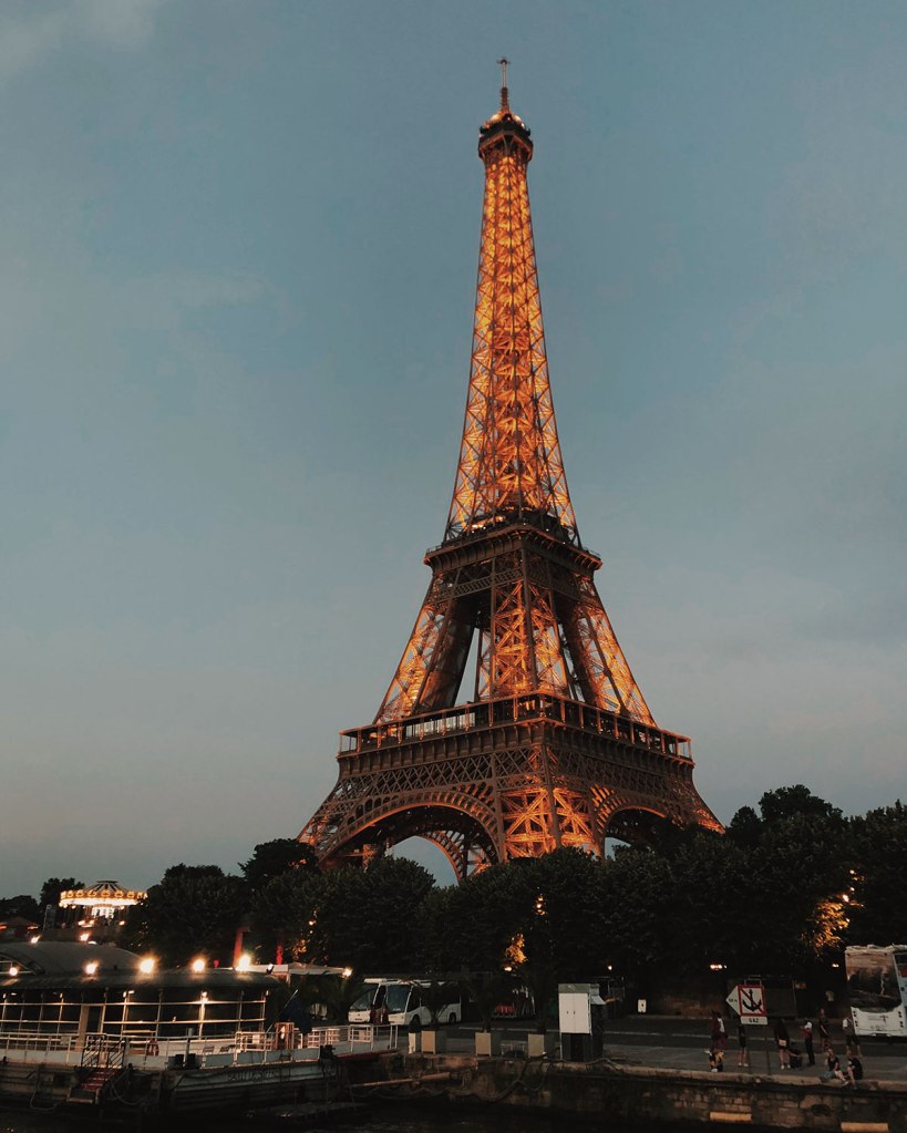 Lo primero que hicimos fue dejar las maletas en el hotel, cambiarnos y salir a pasear. Ese día fuimos a tomarnos fotos a Trocadero y luego nos subimos al último paseo en bote por el Río Sena. Gran idea haberlo tomarlo a esa hora porque el sol no pegaba tan fuerte, los colores de los edificios y el atardecer oscilaban en preciosos tonos cálidos y pudimos apreciar la Torre Eiffel encendida.